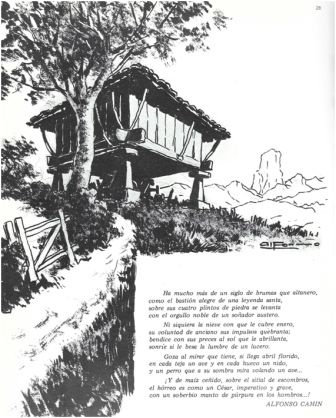 En el apartado hórreos, incluimos unos dibujos introductorios, así como un poema de Alfonso Camín sobre ese elemento inseparable de la casería asturiana. Pertenecen todos ellos a «El libro de los hórreos», publicado en 1975 por Bankunión, y teniendo como autor a nuestro Alfonso Iglesias ,«Alfonso», (Navia, Asturias, 1910 – Oviedo, 1988), dibujante, comediógrafo y pintor, padre de las Aventuras de Pinín, de Pinón, Telva y la vaca Venancia, y de tantos otros personajes entrañables de aventuras asturianas. Como el mismo autor reconoce: «En él no esperéis encontrar una visión completa y documentada de lo que son los hórreos, ni tampoco un trabajo exhaustivo y técnico. En estas páginas sólo aspiro a ofrecer una sencilla estampa colorista y fugaz…». En la introducción del libro Alfonso se emociona: « ¡Los hórreos no desaparecerán! ¡Los hórreos seguirán levantados sobre los praderíos de Asturias! Esos viejos hórreos, tan nuestros, tan queridos por los asturianos, continuarán donde están. Porque entre sus trabes y sus colondras se encierran trozos de la historia de nuestra agricultura, en sus maderas carcomidas, en sus puertas talladas por manos artesanas, en sus airosos pegollos que lo elevan al cielo, se ofrecen claros testimonios de la vida y las costumbres campesinas de un ayer…».